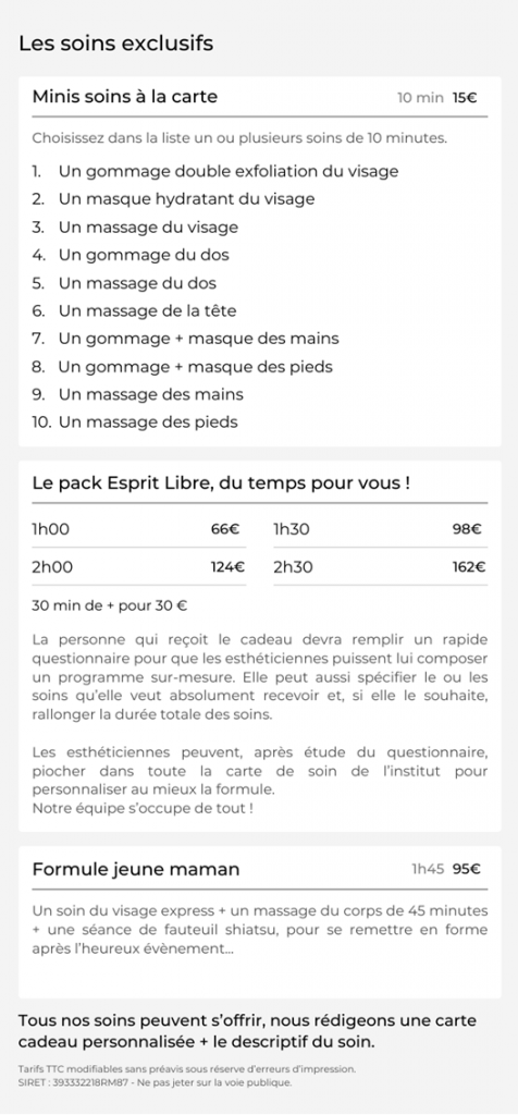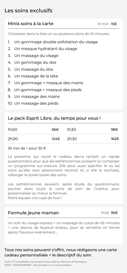 Formule également très facile à offrir. En fonction de votre budget, vous pouvez offrir le nombre de minis soins que vous voulez …