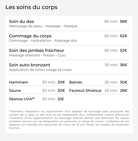 plus 30 min. de soin variant en fonction de l'élément choisi .